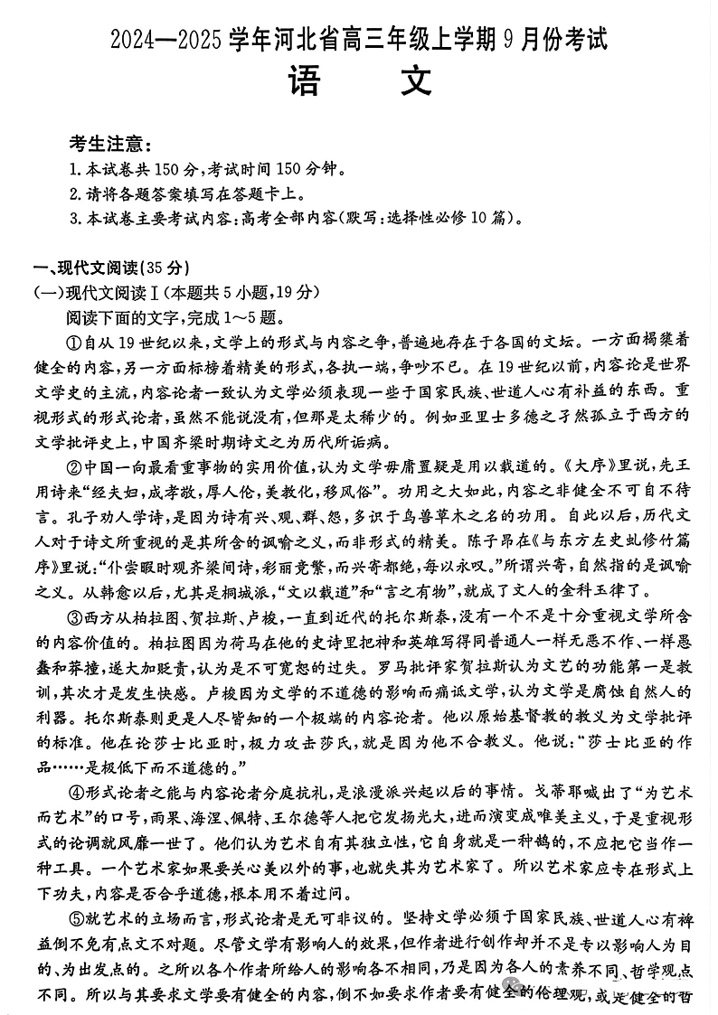 河北省2024-2025学年高三年级上学期9月份考试+语文