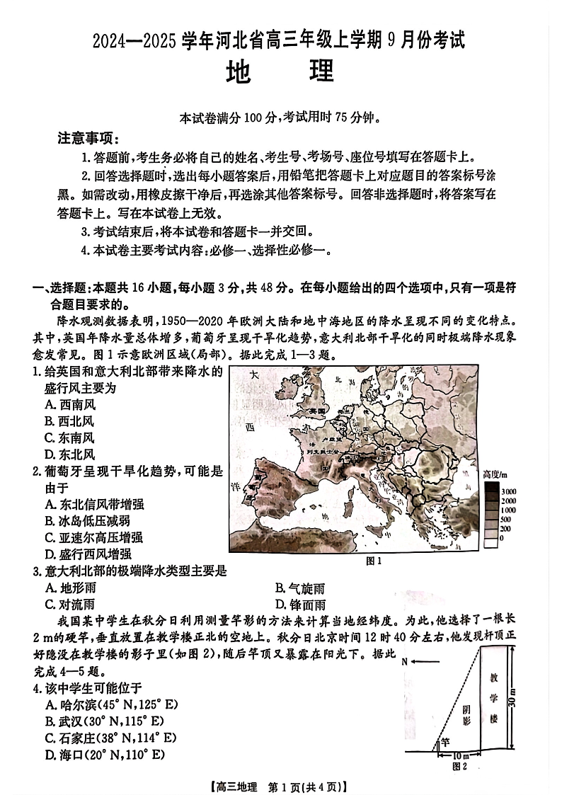 河北省2024-2025学年高三年级上学期9月份考试+地理