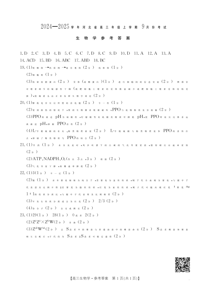河北省2024-2025学年高三年级上学期9月份考试+生物答案