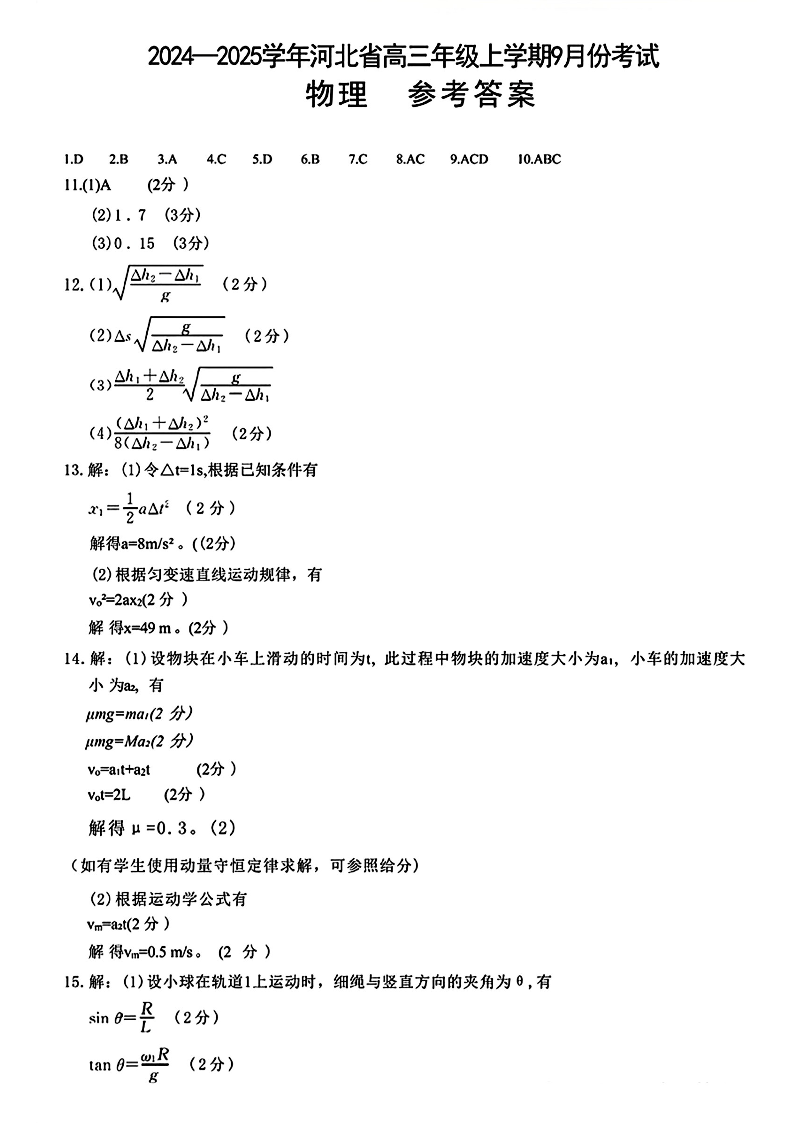 河北省2024-2025学年高三年级上学期9月份考试+物理答案