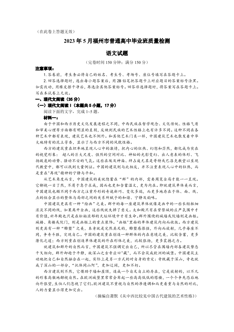 2023年5月福州市普通高中毕业班质量检测 语文含答案