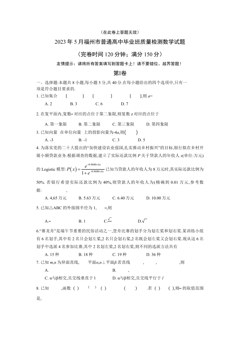2023年5月福州市普通高中毕业班质量检测 数学含答案