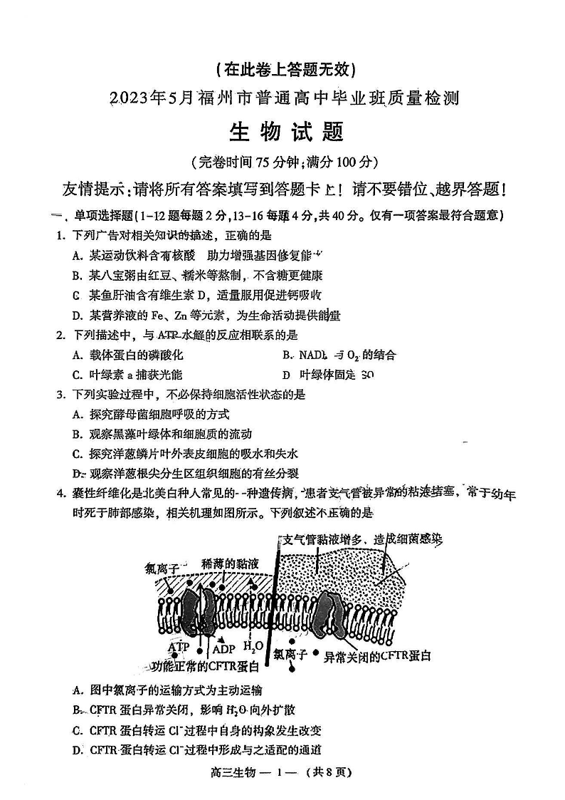 2023年5月福州市普通高中毕业班质量检测 生物含答案