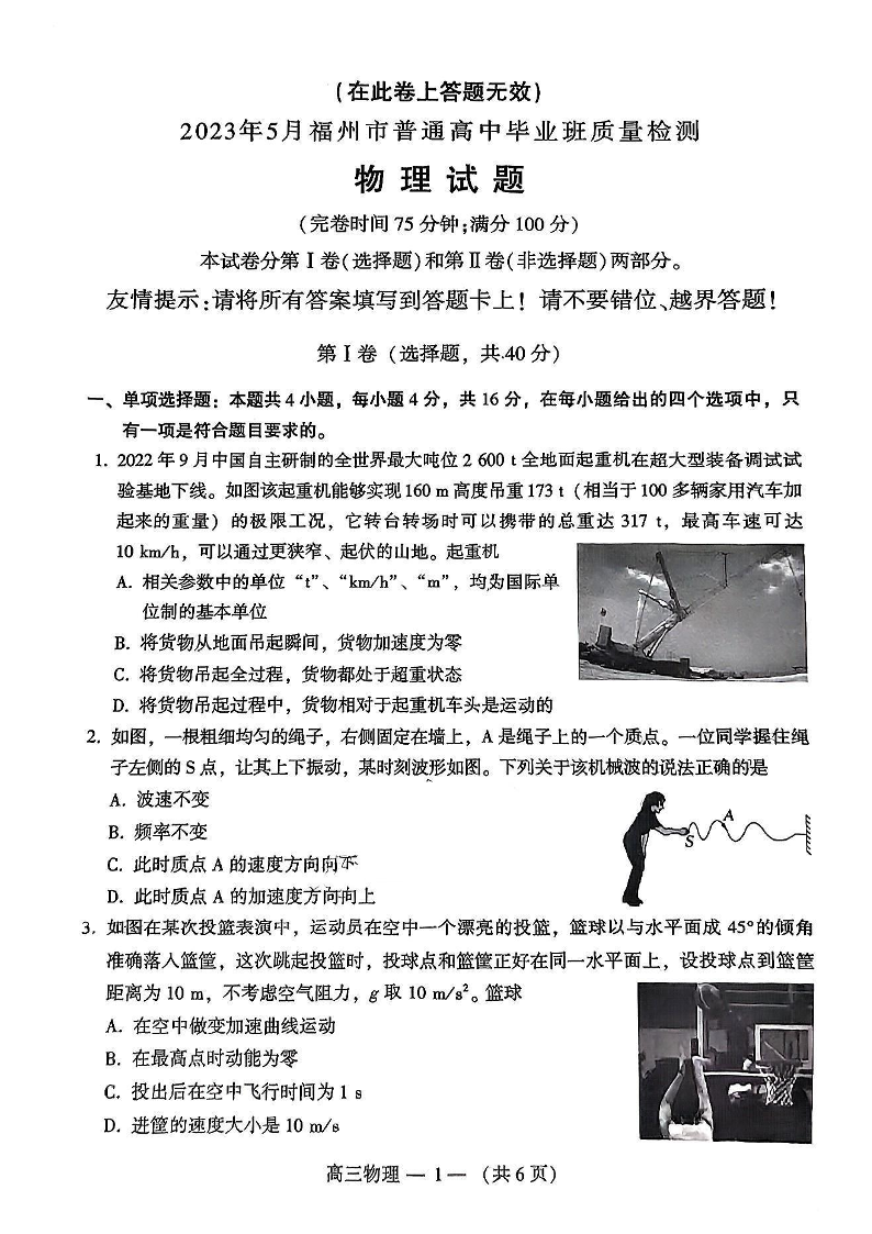 2023年5月福州市普通高中毕业班质量检测 物理含答案