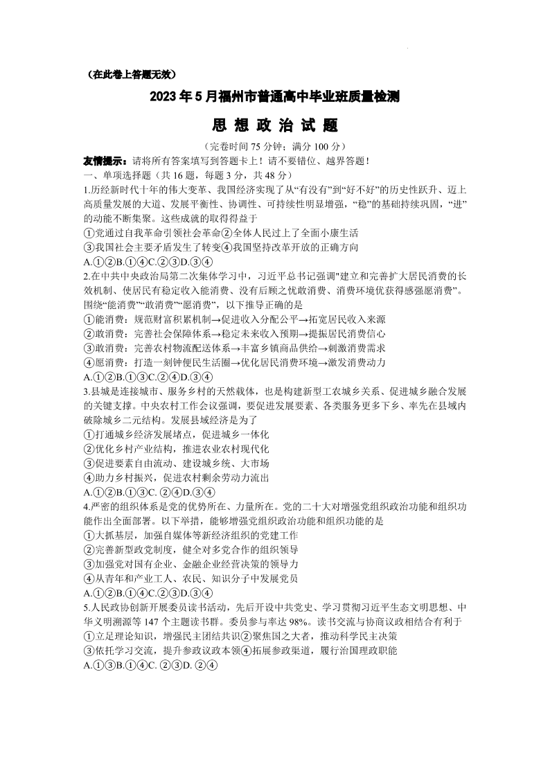 2023年5月福州市普通高中毕业班质量检测 政治含答案