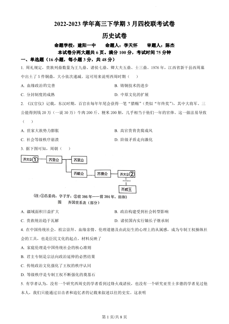 福建省南平市2022-2023学年高三下学期3月四校联考历史试题