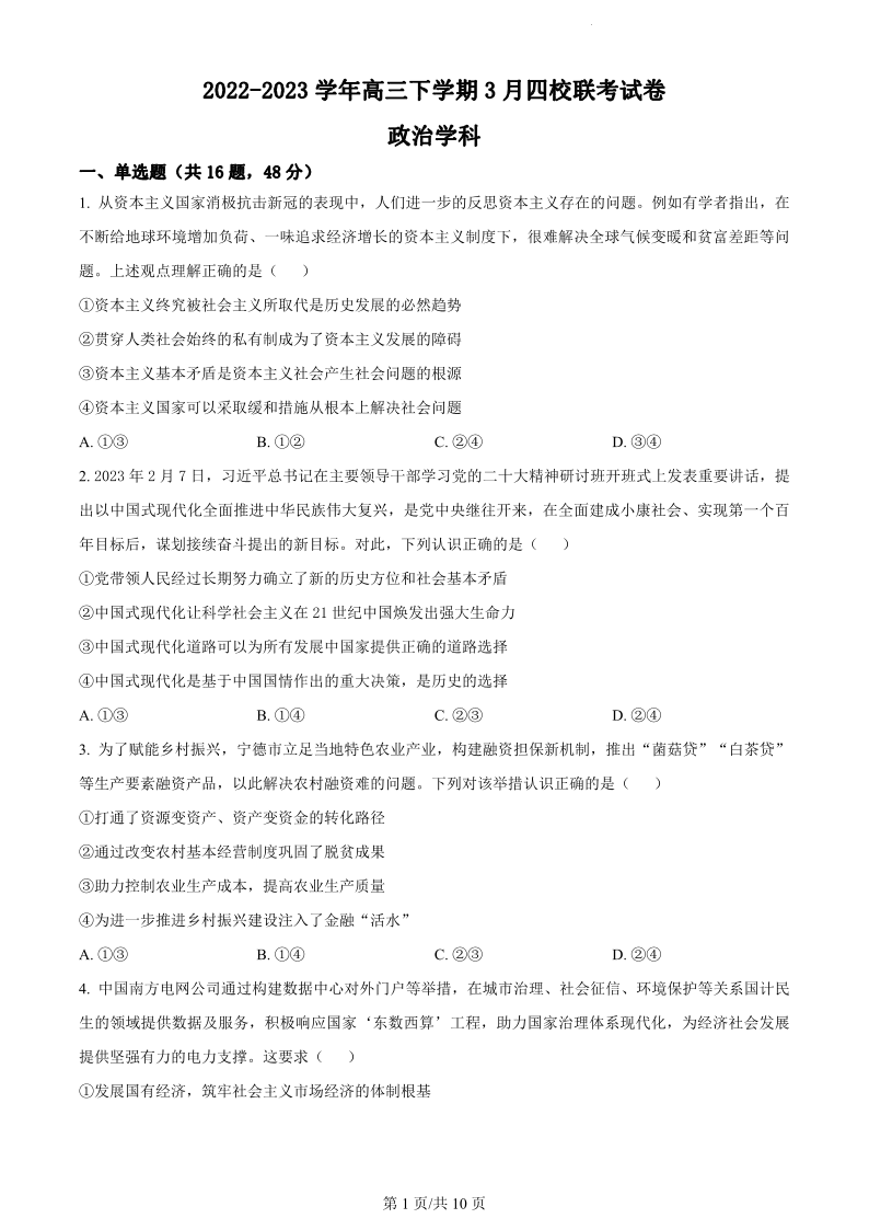 福建省南平市2022-2023学年高三下学期3月四校联考政治试题