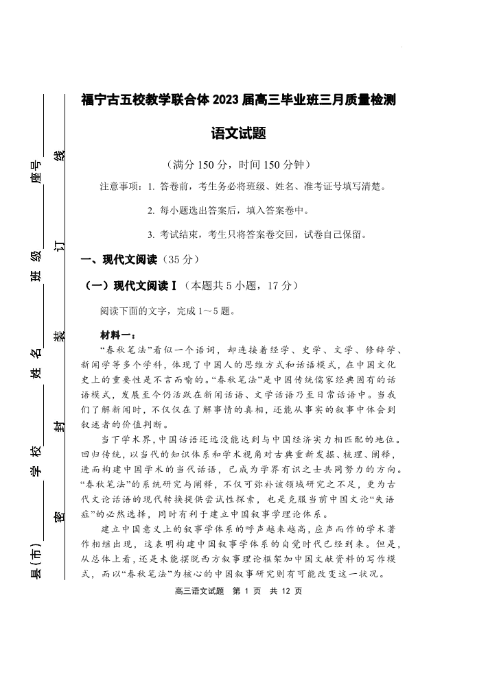 2023届福建省宁德市五校教学联合体高三毕业班3月质量检测语文试卷