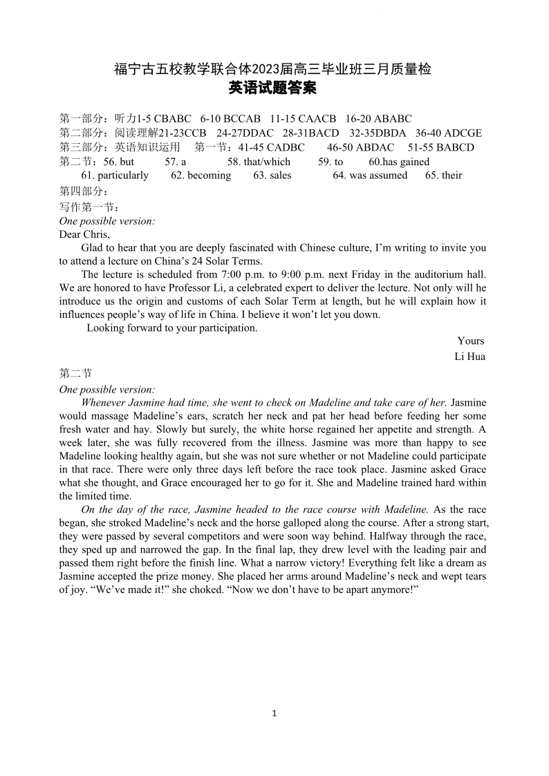 2023届福建省宁德市五校教学联合体高三毕业班3月质量检测英语答案
