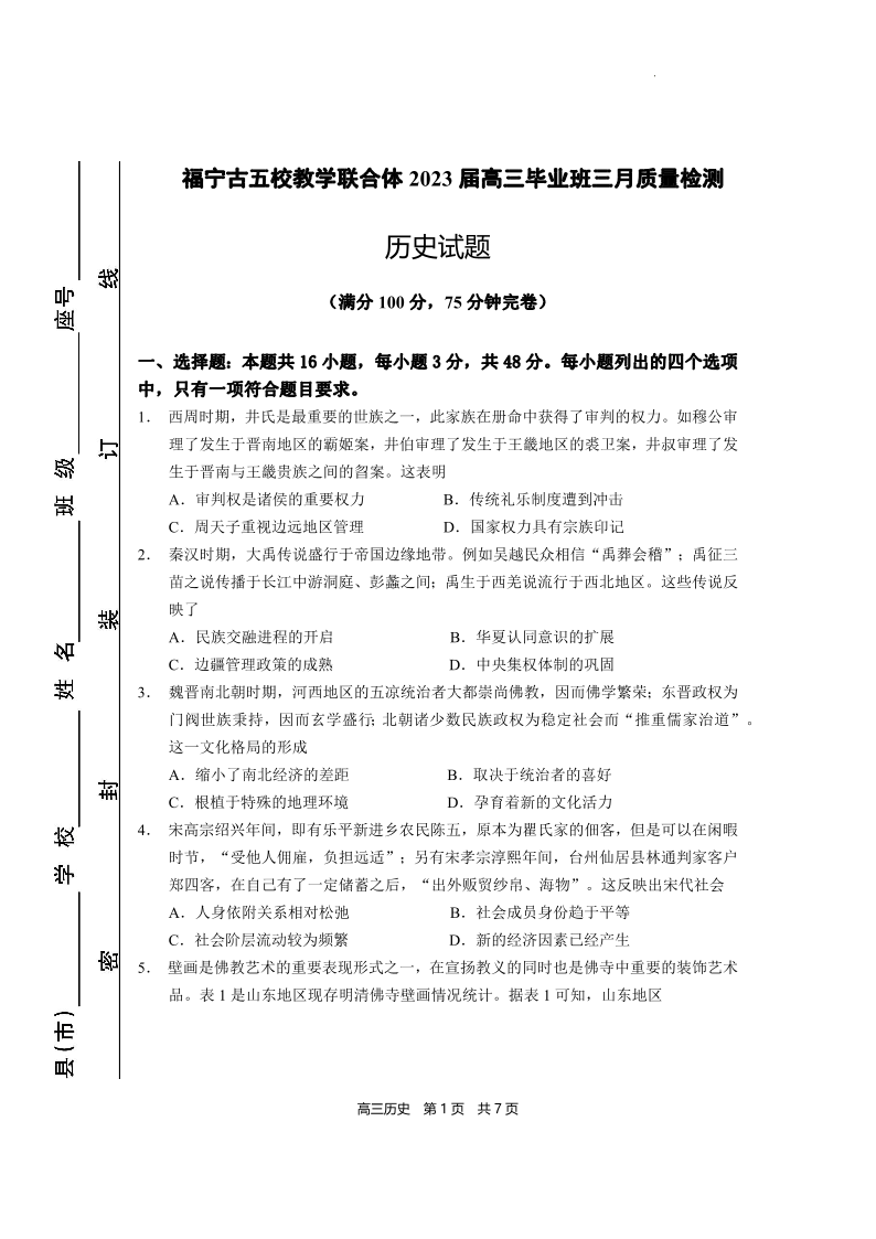 2023届福建省宁德市五校教学联合体高三毕业班3月质量检测历史试题