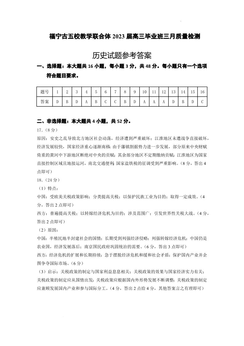 2023届福建省宁德市五校教学联合体高三毕业班3月质量检测历史答案