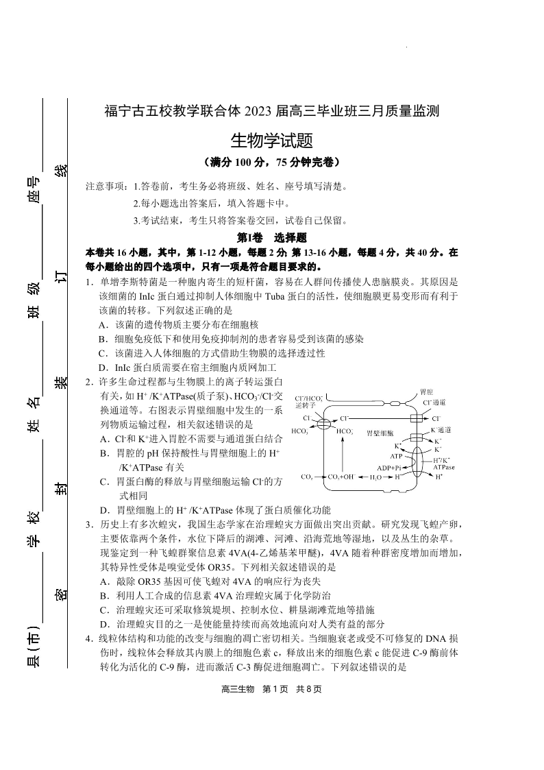 2023届福建省宁德市五校教学联合体高三毕业班3月质量检测生物试题