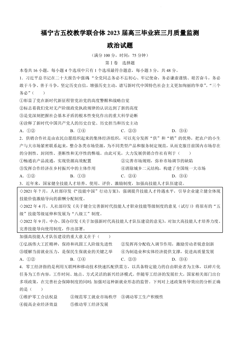 2023届福建省宁德市五校教学联合体高三毕业班3月质量检测政治试题