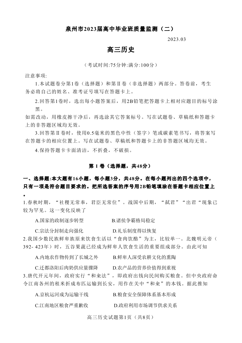 福建省泉州市2022-2023学年高三毕业班质量监测(三)历史试卷