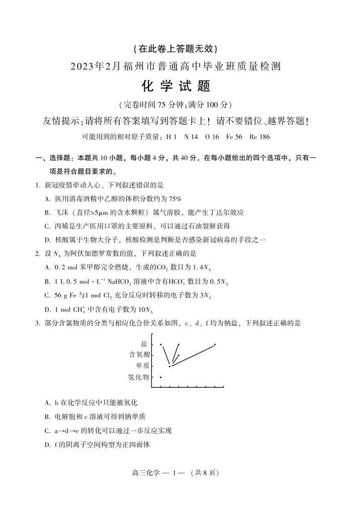 2023.3.1上午普通高中毕业班质量抽测试题(化学)