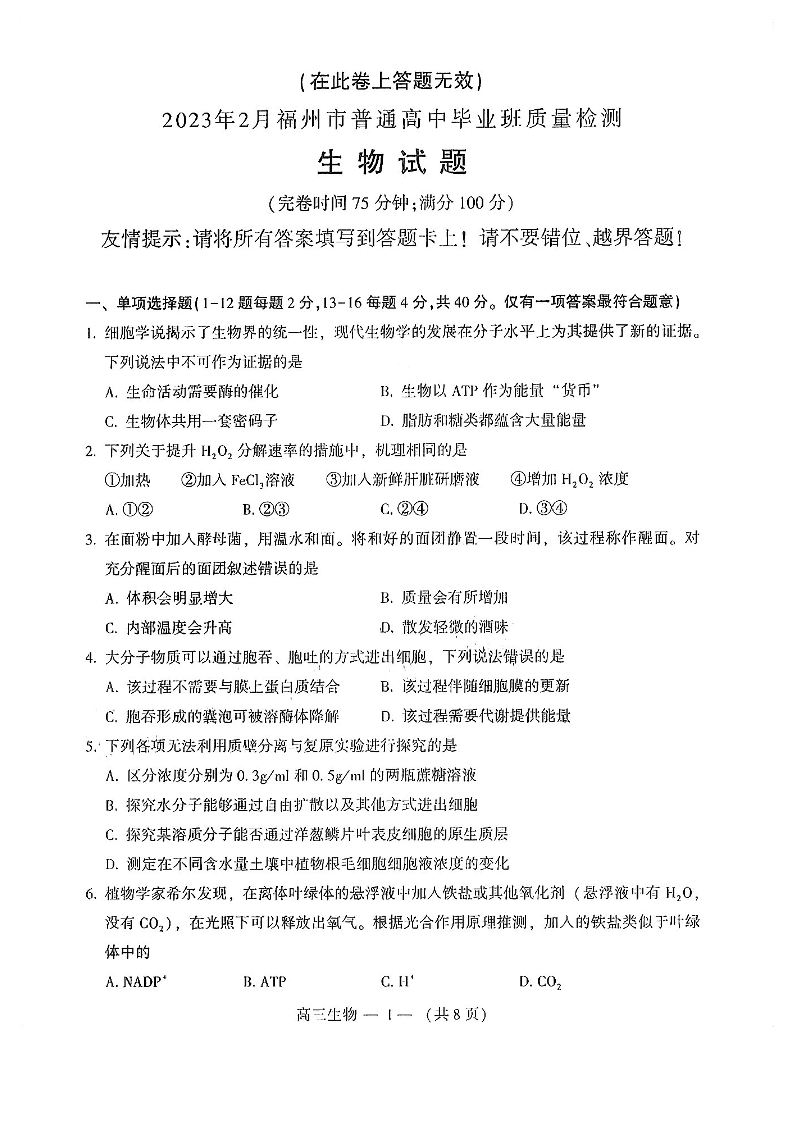 2023届福建省福州市高三普通高中毕业班质量检测(二检)生物试卷