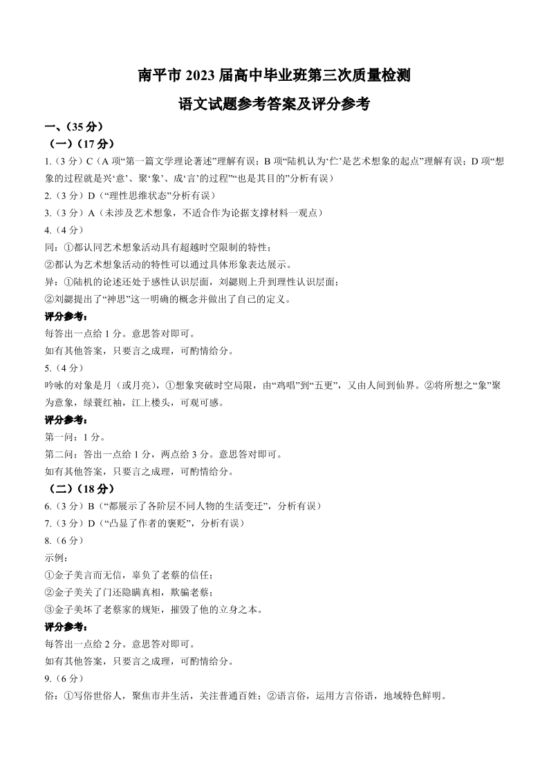 2023届福建省南平市2023届高中毕业班第三次质量检测 语文答案