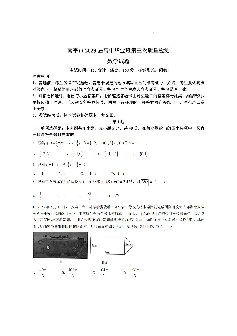 2023届福建省南平市2023届高中毕业班第三次质量检测 数学