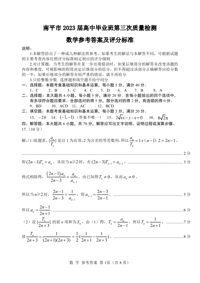 2023届福建省南平市2023届高中毕业班第三次质量检测 数学答案