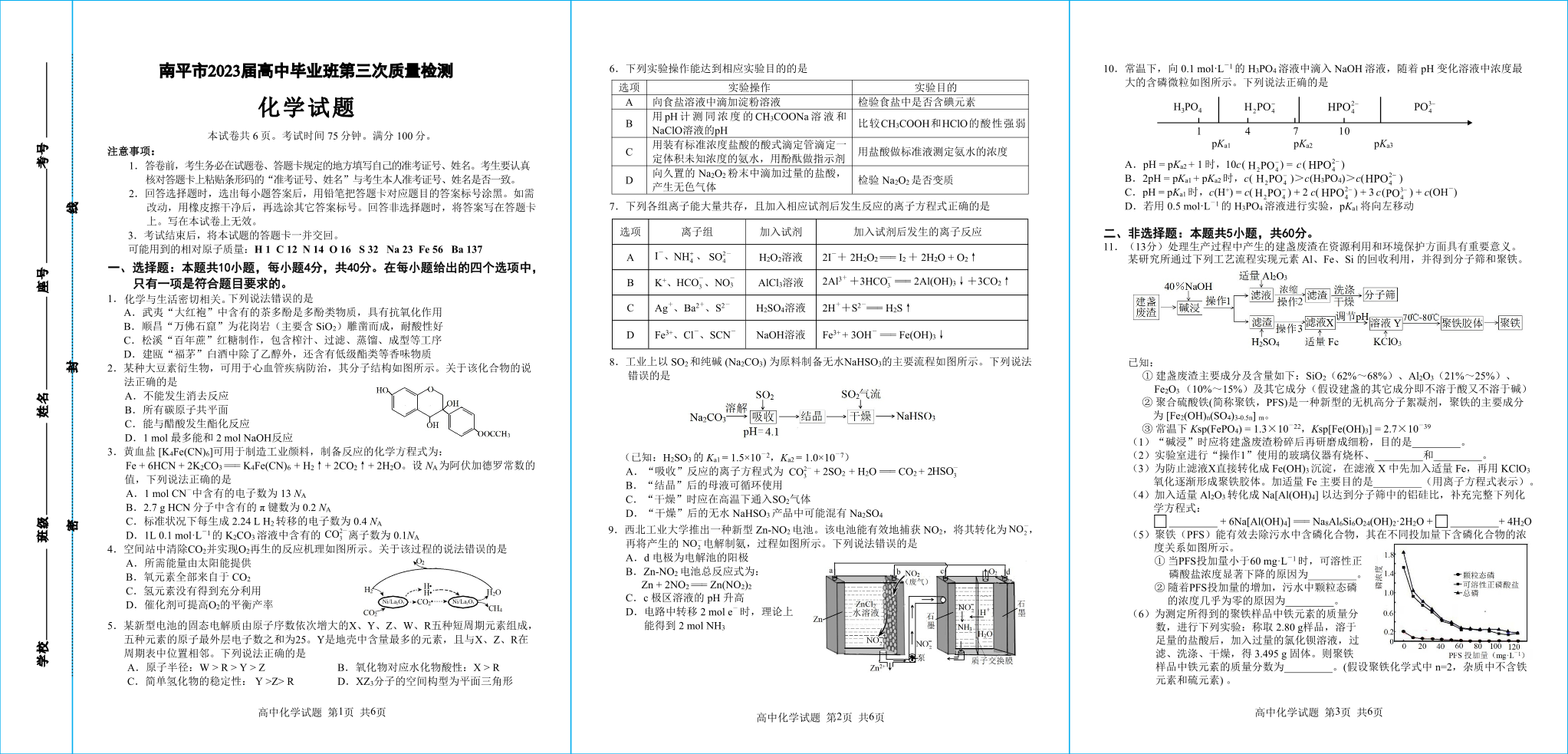 2023届福建省南平市2023届高中毕业班第三次质量检测 化学