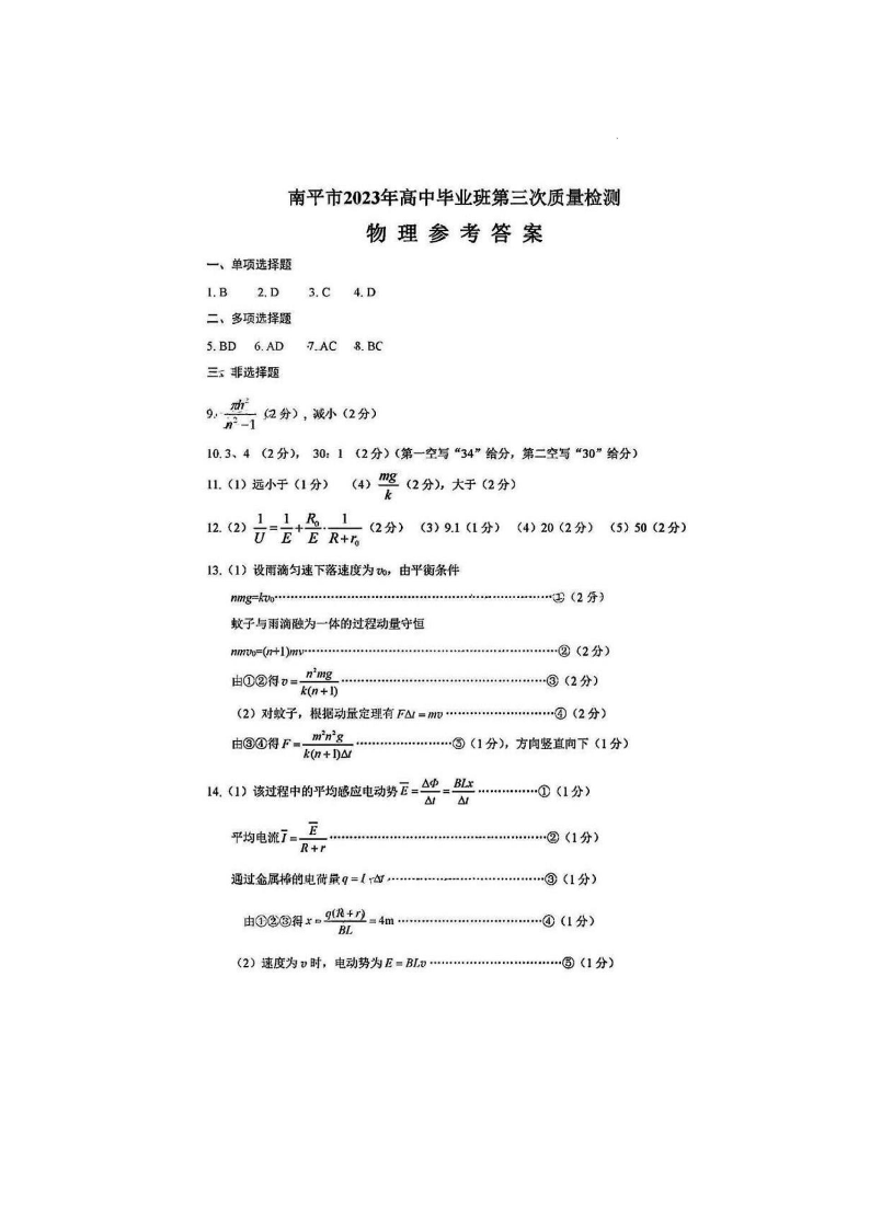 2023届福建省南平市2023届高中毕业班第三次质量检测 物理答案