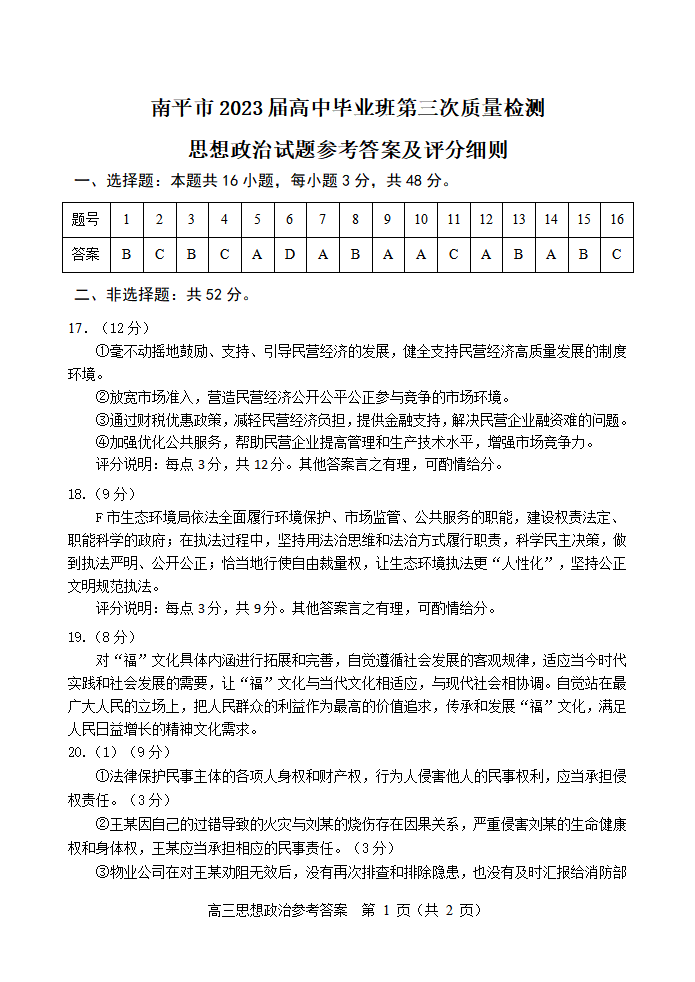 2023届福建省南平市2023届高中毕业班第三次质量检测 政治答案