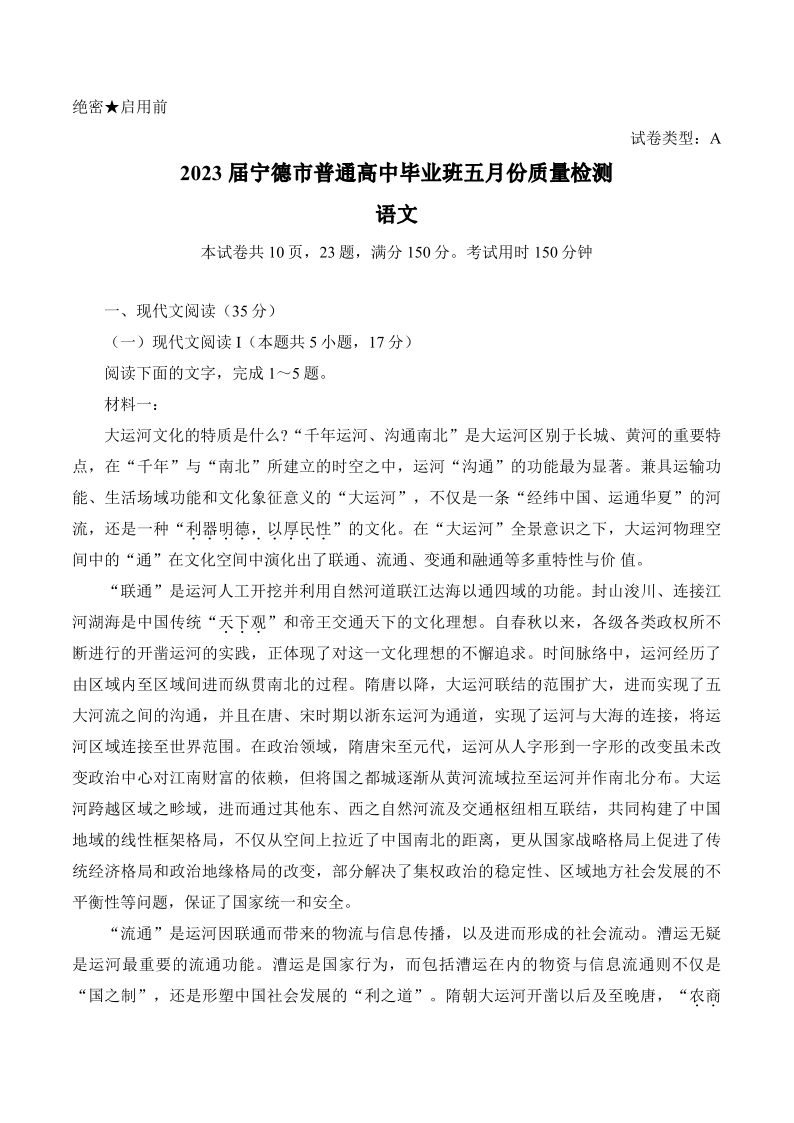 2023届福建省宁德市普通高中毕业班5月份质量检测语文试卷