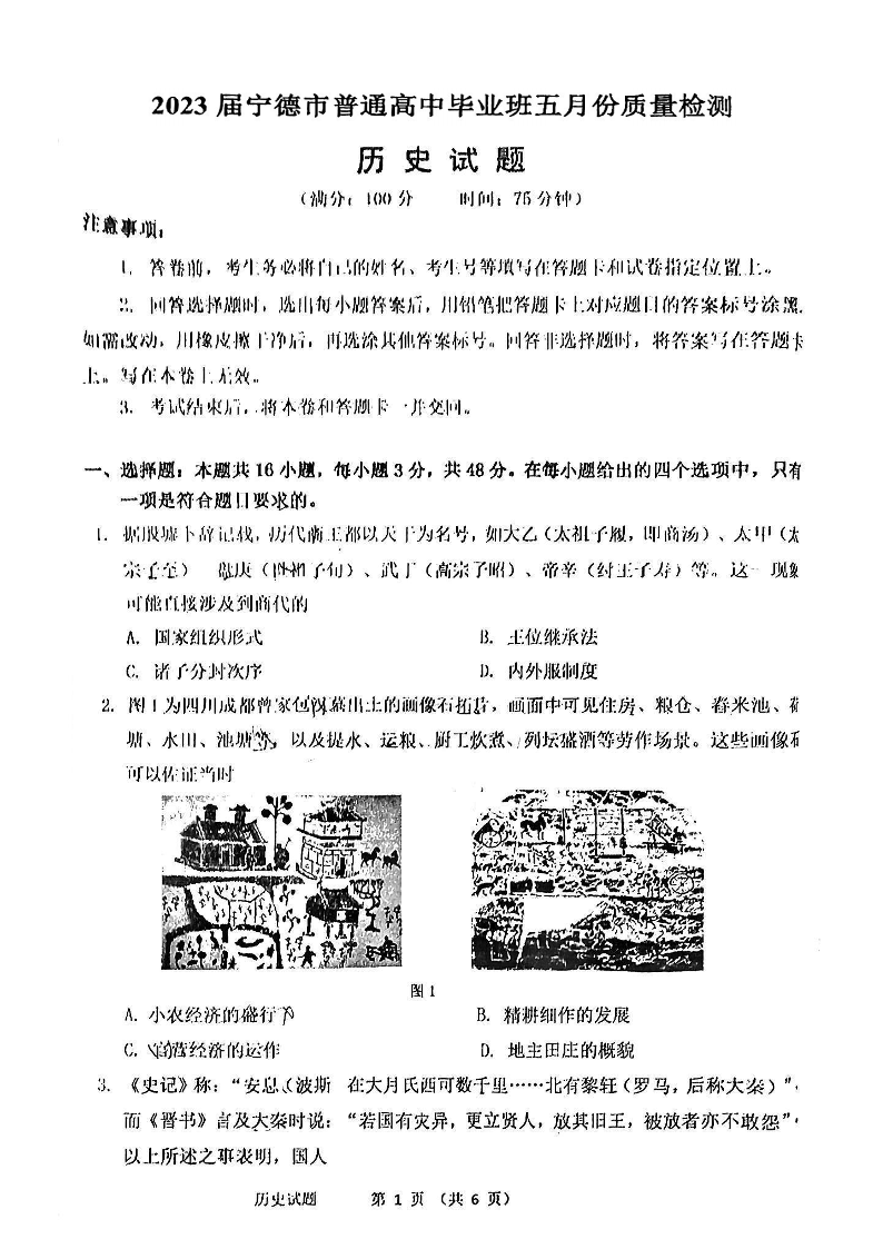 2023届福建省宁德市普通高中毕业班5月份质量检测历史试卷