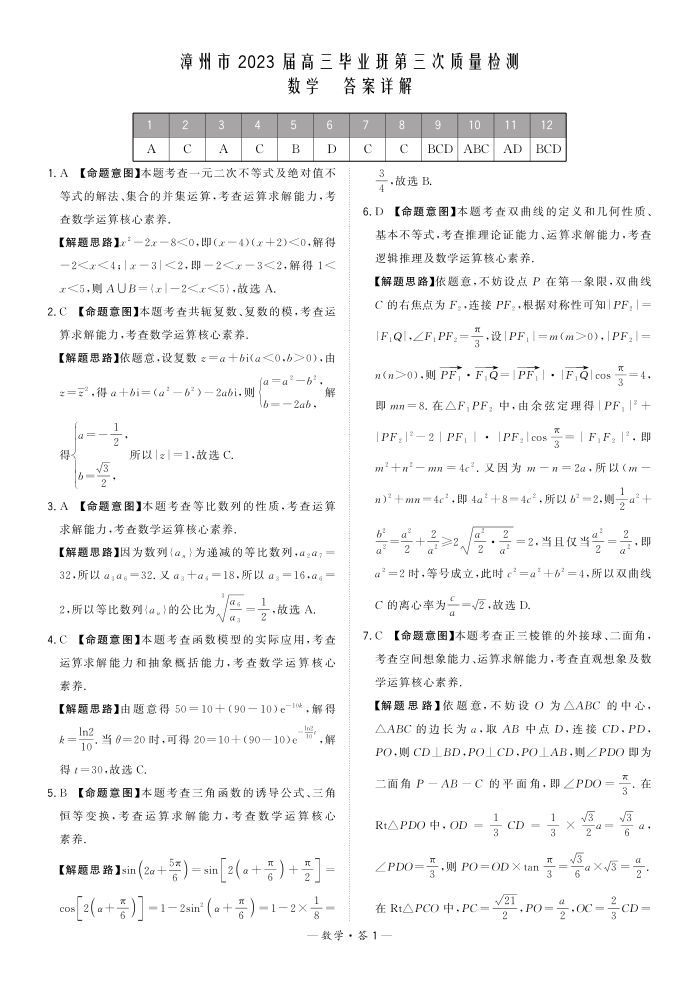 2023届福建省漳州市高三毕业班下学期第三次质量检测 数学答案