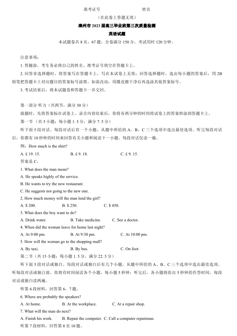 2023届福建省漳州市高三毕业班下学期第三次质量检测 英语试卷