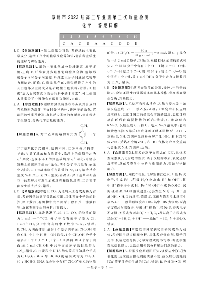 2023届福建省漳州市高三毕业班下学期第三次质量检测 化学答案