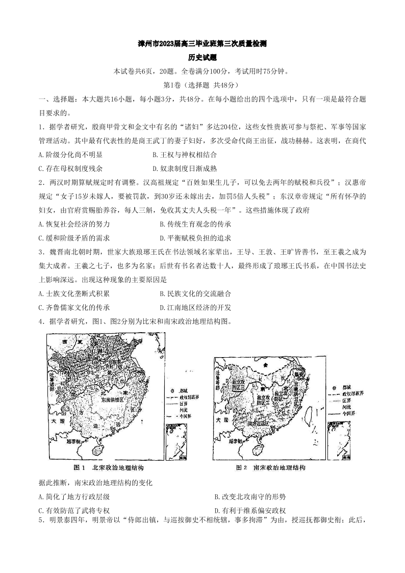 2023届福建省漳州市高三毕业班下学期第三次质量检测 历史试卷