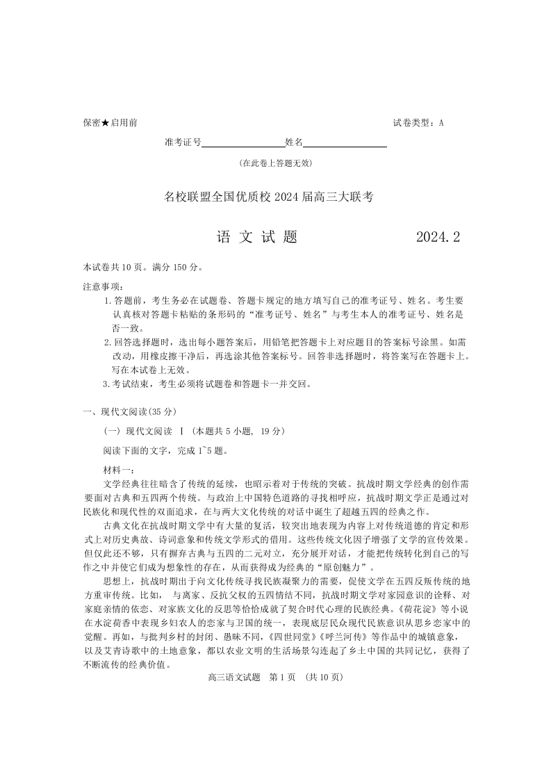 2024届福建省名校联盟全国优质校高三上学期2月大联考 语文