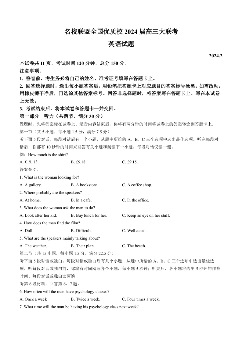 2024届福建省名校联盟全国优质校高三上学期2月大联考 英语