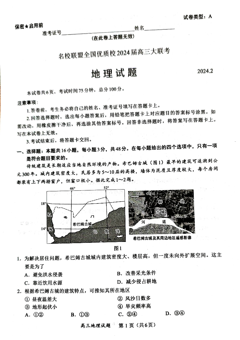 2024届福建省名校联盟全国优质校高三上学期2月大联考 地理