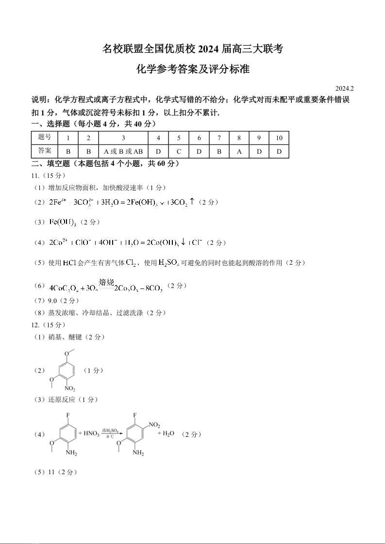 2024届福建省名校联盟全国优质校高三上学期2月大联考 化学答案