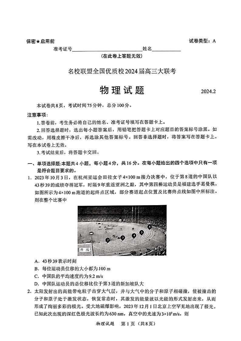 2024届福建省名校联盟全国优质校高三上学期2月大联考 物理