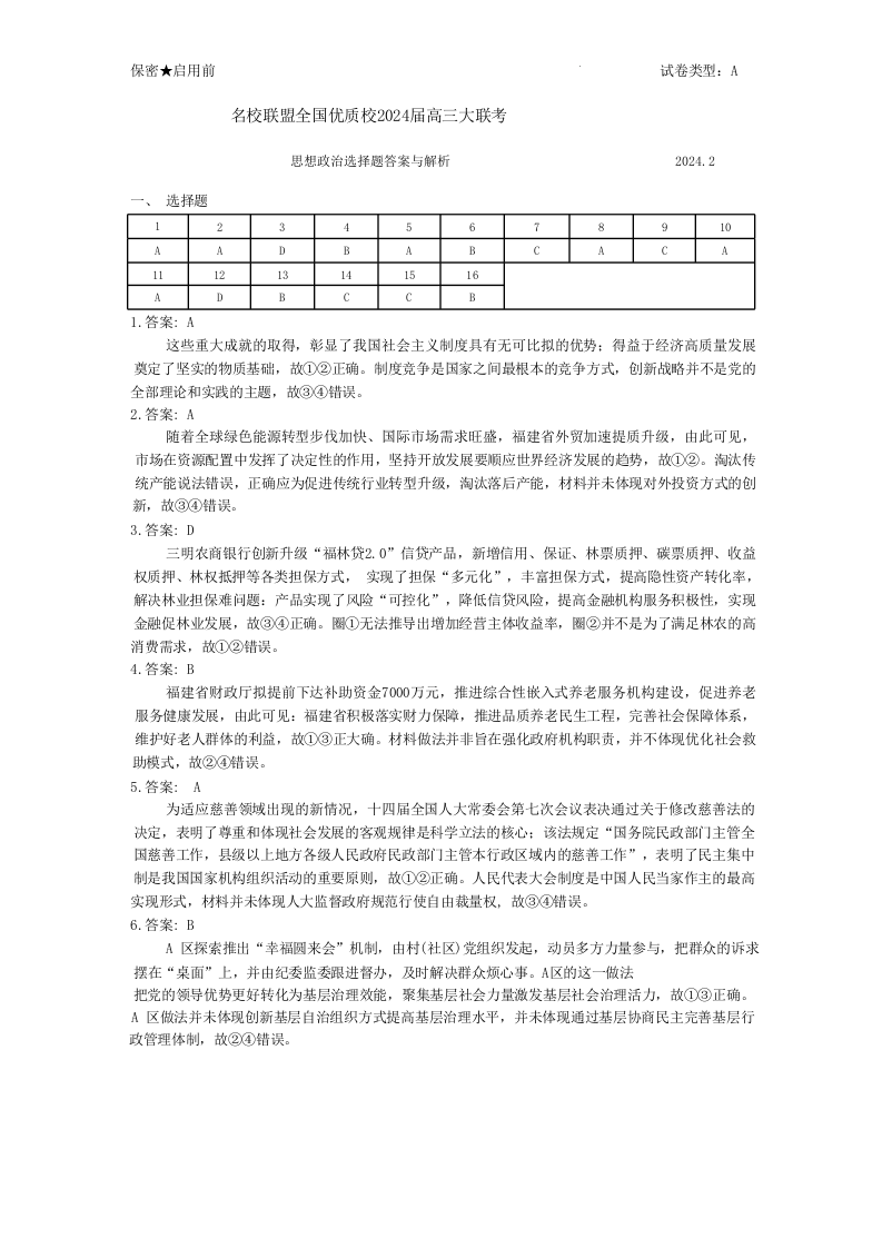 2024届福建省名校联盟全国优质校高三上学期2月大联考 政治答案