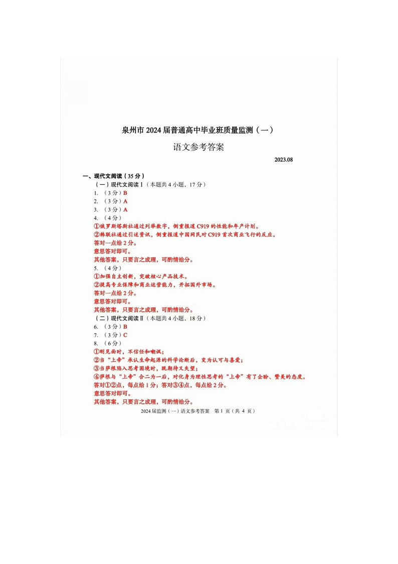 2024届福建省泉州市高中毕业班质量检测(一)语文答案
