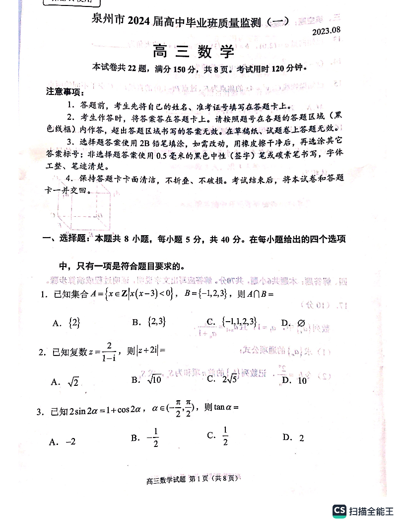2024届福建省泉州市高中毕业班质量检测(一)数学