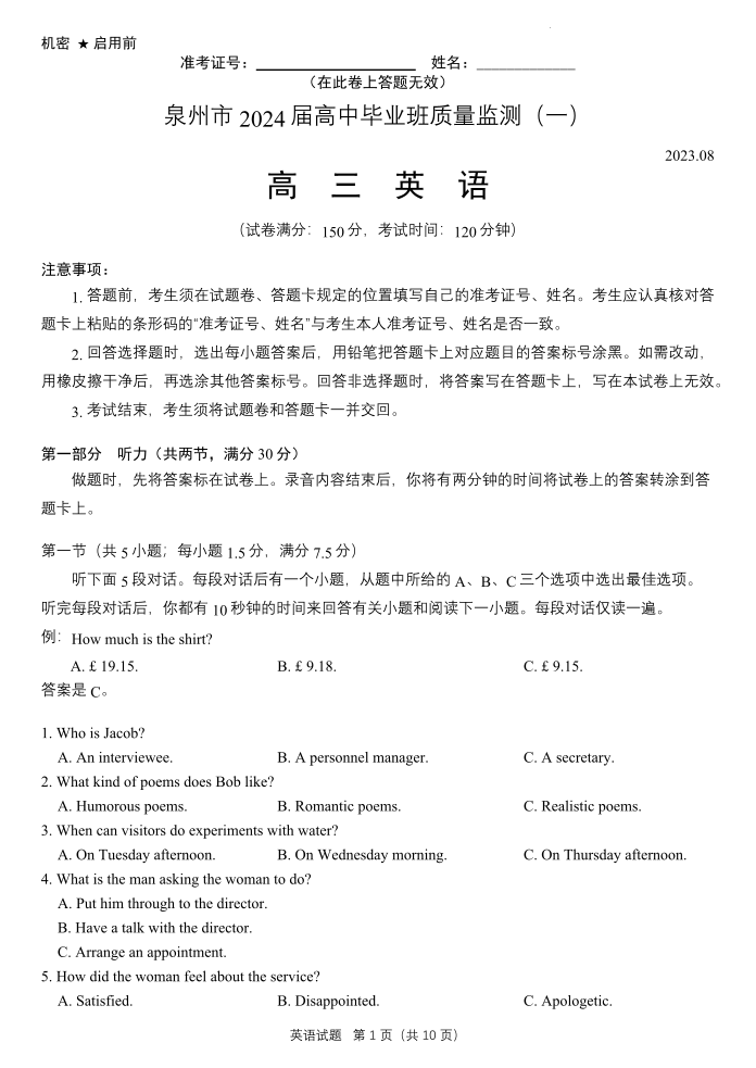 2024届福建省泉州市高中毕业班质量检测(一)英语