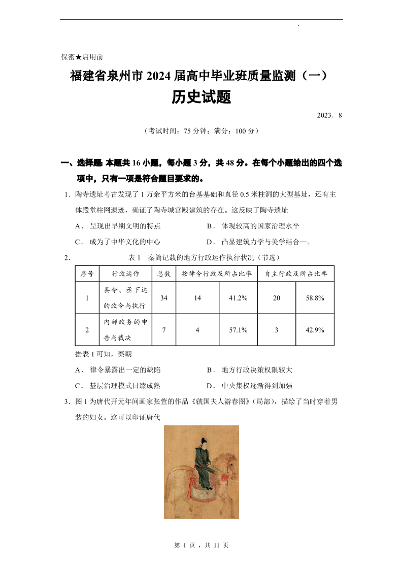2024届福建省泉州市高中毕业班质量监测(一)历史