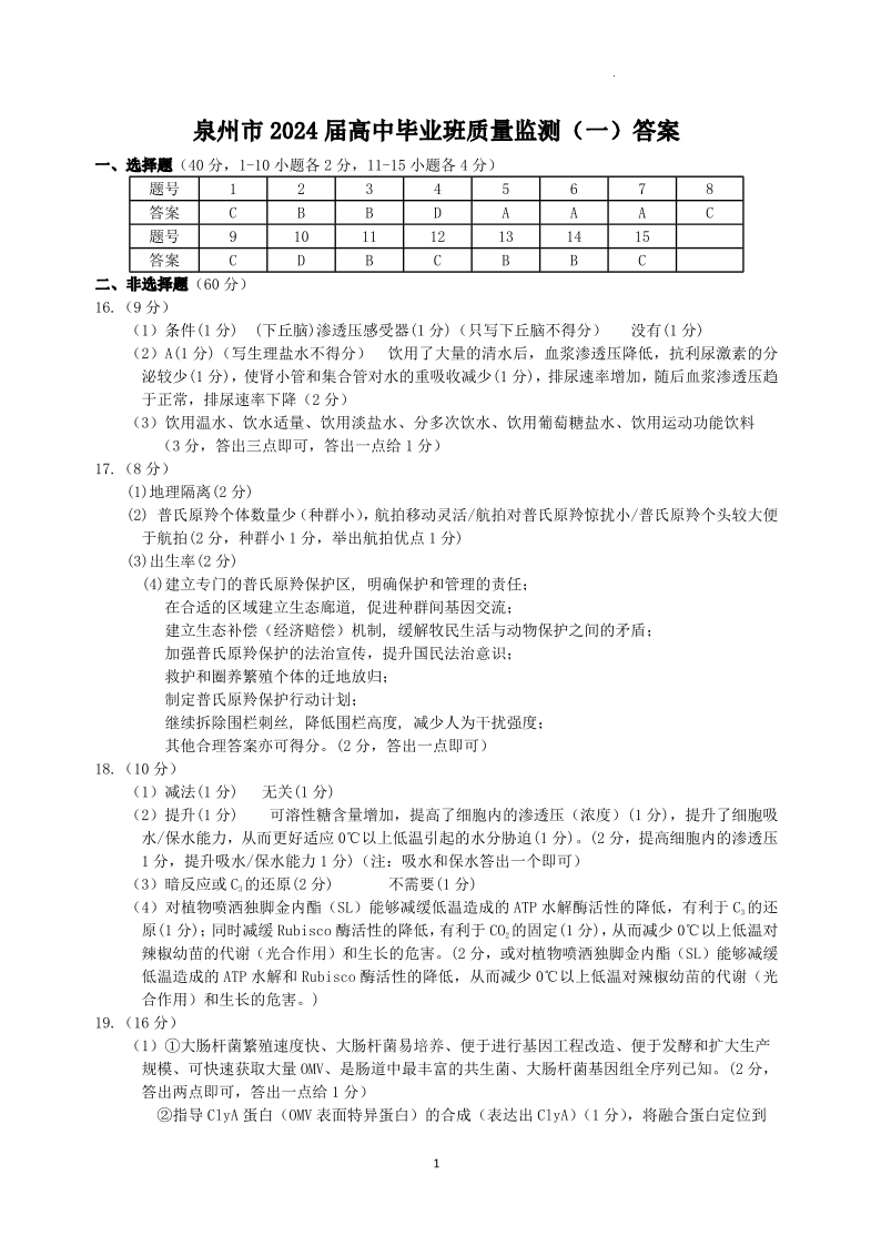 2024届福建省泉州市高中毕业班质量检测(一)生物答案