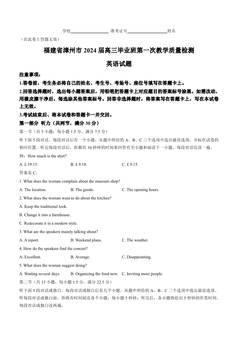 2024届福建省漳州市高三毕业班上学期第一次教学质量检测 英语