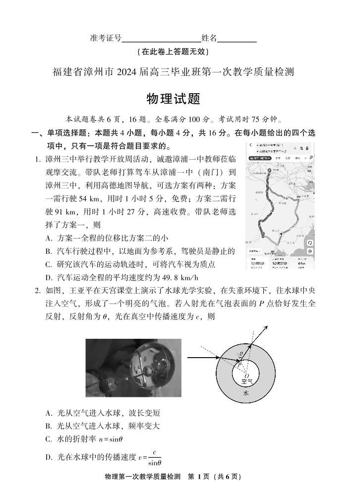 2024届福建省漳州市高三毕业班上学期第一次教学质量检测 物理
