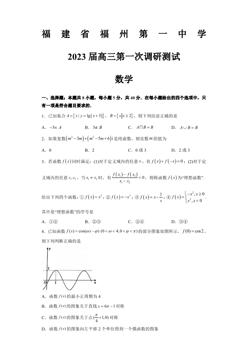福建省福州第一中学2022-2023学年高三上学期第一次调研测试数学