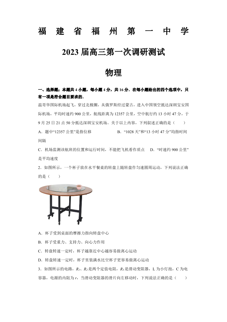 福建省福州第一中学2022-2023学年高三上学期第一次调研测试物理