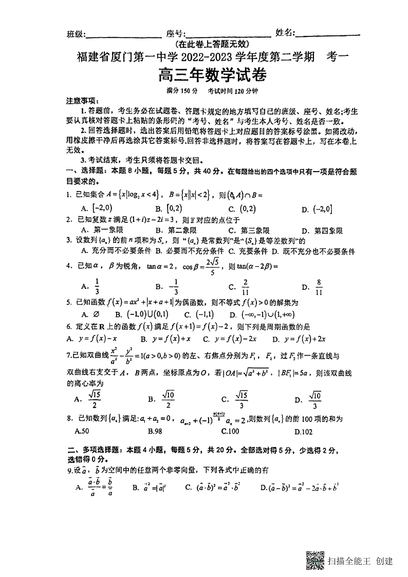 福建省厦门第一中学2022-2023学年高三下学期一模数学试题