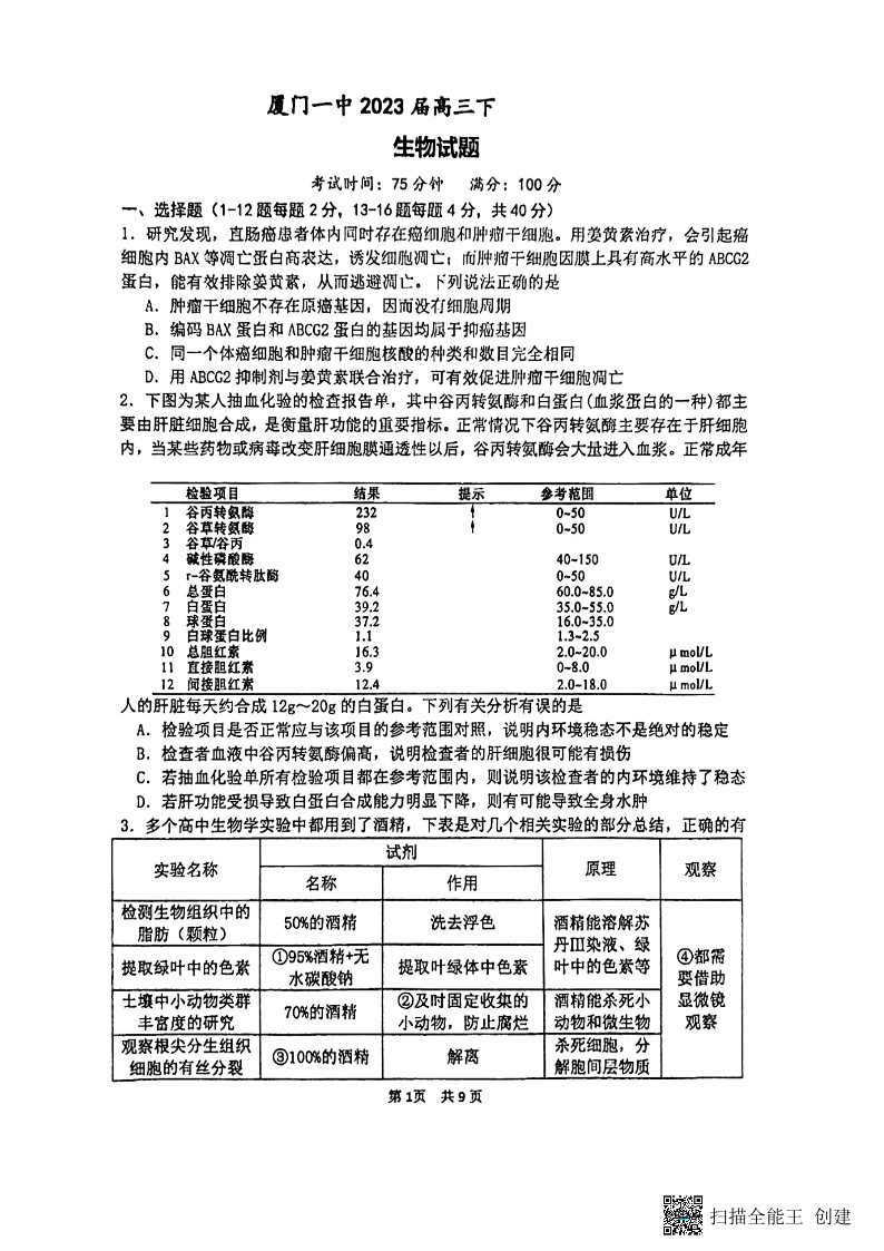 福建省厦门第一中学2022-2023学年高三下学期一模生物试题