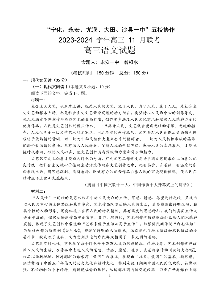 福建省“宁化、永安、尤溪、大田、沙县一中”五校协作2023-2024学年高三上学期11月联考 语文